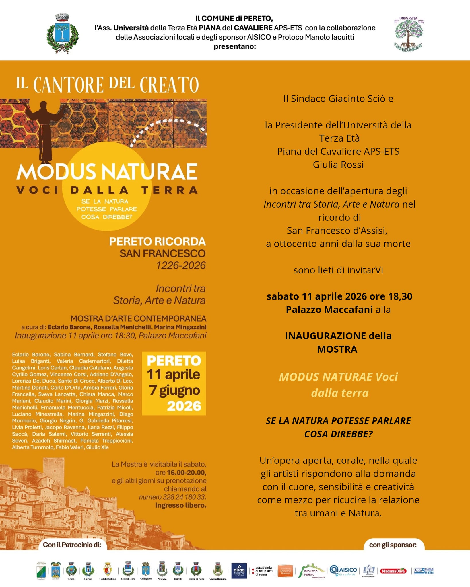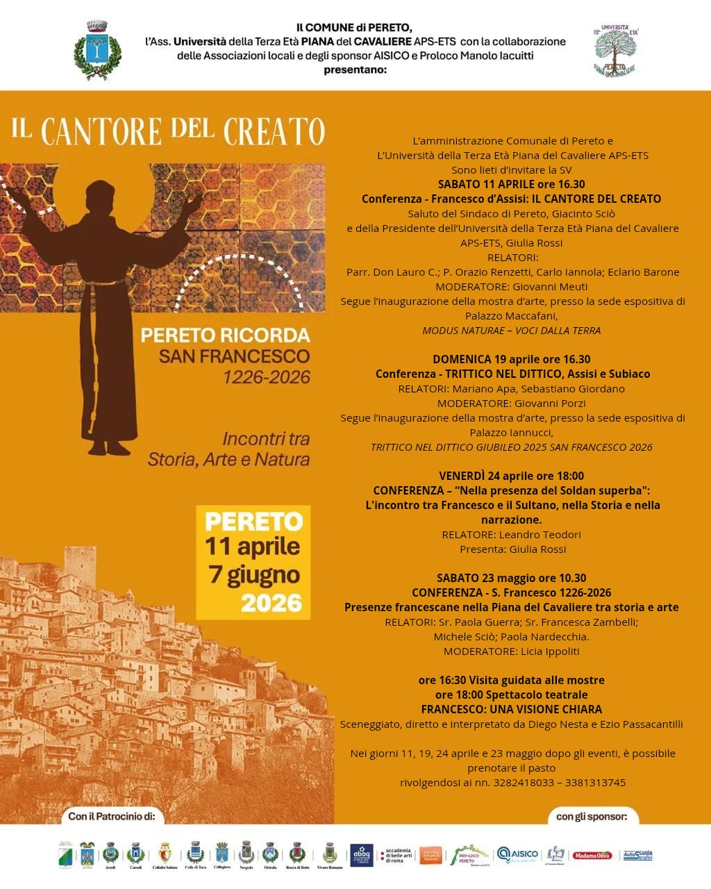 Il Comune di Pereto e l'Associazione Università della Terza Età Piana del Cavaliere APS-ETS, con la collaborazione delle associazioni locali e degli sponsor AISICO e Proloco Manolo Iacuitti, presentano "Il Cantore del Creato – Pereto Ricorda San Francesco 1226-2026", un ricco ciclo di eventi culturali dedicati alla figura di Francesco d'Assisi, nel VIII centenario della sua morte.